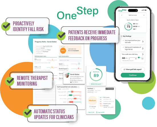 OneStep is an AI-powered digital care platform that uses smartphone sensors to transform real-life movement into clinical insights, helping healthcare providers assess, treat, and monitor patients from anywhere. Gait (i.e. human motion) is a leading indicator of health, and by making gait analysis as simple as stepping on a bathroom scale, OneStep empowers clinicians with actionable data to improve mobility, reduce falls, and enhance patient engagement. Our FDA-listed technology eliminates the need for wearables, delivering lab-quality gait and motion analysis in seconds.